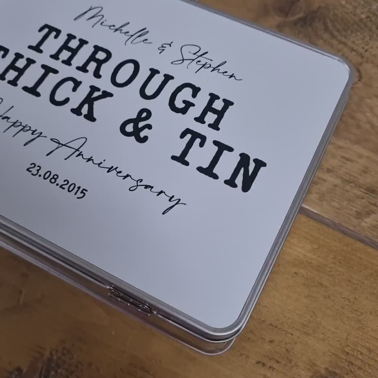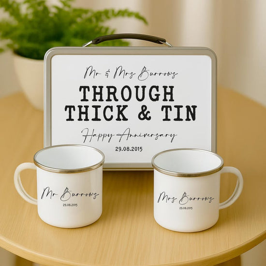 Celebrate a decade of love in style with this charming Tin Anniversary Gift – the perfect present for a 10 Year Wedding Anniversary, also known as the Tin Anniversary! Whether it’s for Mr & Mrs, husband and wife, or any loving couple marking ten amazing years together, this thoughtful and practical gift is sure to be cherished. We also can include matching tin mugs to go with your box if you choose the full set in the drop-down menu.