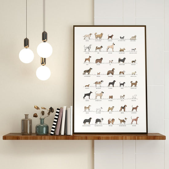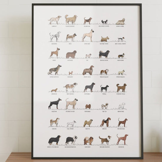 A high-quality Dog Breed inspired poster featuring some of the most common dogs from around the world! A lovely piece of art for any dog lover! Printed on high-quality 210gsm art paper using UV fade-resistant inks which will last for years to come.