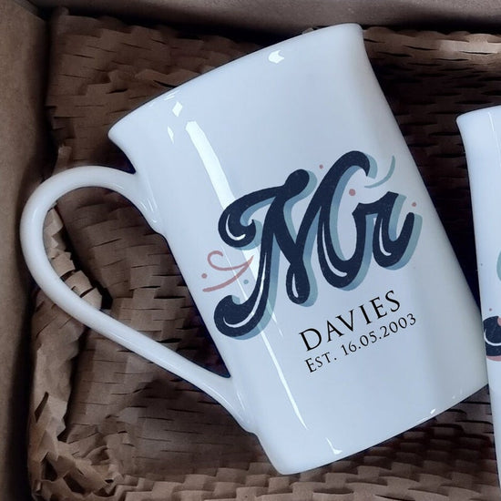 Start every morning with a touch of elegance with our Personalised Mr and Mrs Bone China Mugs. Made from fine bone china, these mugs bring a delicate, sophisticated feel to every sip — the perfect gift for newlyweds, or for couples celebrating their 20th anniversary (traditionally known as the ‘China’ anniversary). You can however adjust the date on the back for any occassion or anniversary you wish.