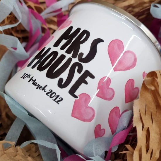 Watercolour heart designed enamel coated tin mug! A wonderful little gift for your Tin Years Anniversary or any other special occasion.