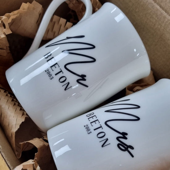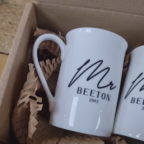 Make your morning coffee or afternoon tea even more special with our personalised bone china mugs! Featuring a sleek and elegant typography black initial design of 'Mr and Mrs' with your surname, and a meaningful message on the back of each mug, this set is the perfect way to celebrate your love and togetherness.