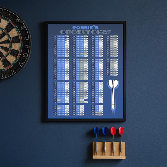 Upgrade your game room with this Personalised Dart Checkout Chart Poster, designed for dart enthusiasts who want a stylish and practical guide right at their fingertips. This custom darts finish chart is ideal for players who love a quick reference while improving their checkout skills. Whether you're a casual player or a competitive thrower, this poster makes a great dartboard companion and will improve your darting ability!