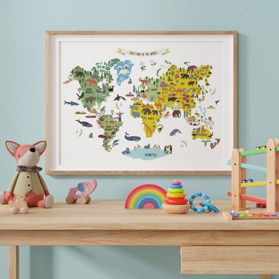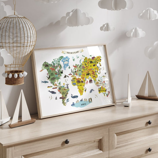 Introducing our Animal World Map Print for children, a delightful addition to your child's bedroom or playroom! This map is educational and provides endless entertainment as it features an array of cute and colourful animals for your little ones to discover and learn about. Our high-quality giclee prints are made using 230gsm archival matte art paper, ensuring that they won't fade or deteriorate over time or with exposure to sunlight.