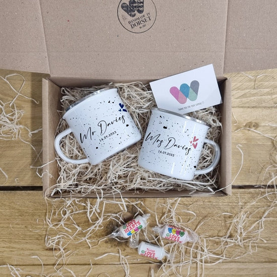 These beautiful mugs are a great gift for the newlyweds, for a 10-year anniversary ( Tin Years ) or to have a special mug set in your cupboard! You can either have 1 or 2 mugs and they are personalised with your surname and date (or a little message if you prefer).