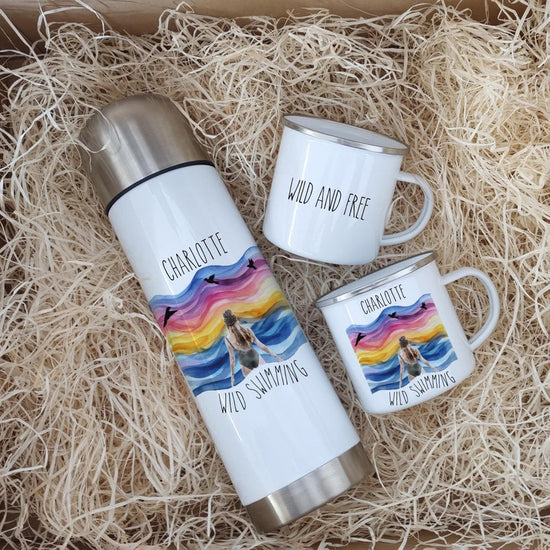 Personalised Wild Swimming Flask and Mug Set – an essential gift for sea swimmers and outdoor adventurers! This unique set includes a custom thermal metal flask and enamel-coated metal mugs, perfect for anyone who loves wild swimming, cold water dips, or coastal adventures. Ideal for keeping drinks warm, each piece is printed with your name and personal message, making it a truly unique gift for ocean lovers, nature enthusiasts, and outdoor explorers.