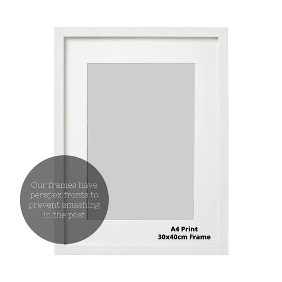Prints available in A5, A4, A3, A2, A1 or we can frame your print. We ONLY offer the white frame as pictured on the listing, We can frame A5, A4 - Which both have mounts or we offer the print in A3 framed without the mount. We offer a selection of print sizes if you want to purchase a frame yourself. If you have a frame already and want the print to fit please message us with size and we will be happy to size it to fit (price will be based on what it is closest to on the listing, for example, if you want 7x5 we would use the price for A5 as this is close enough).