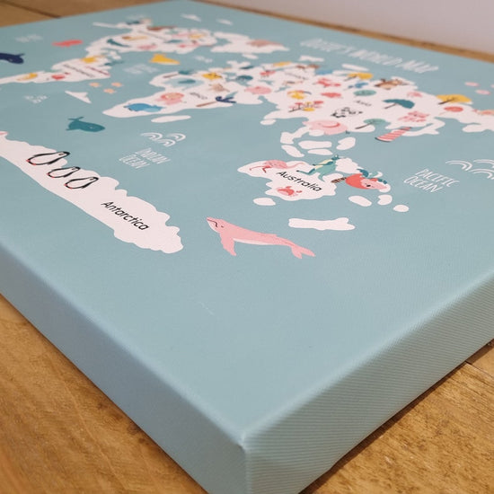 Enhance your child's learning experience with our playful hand-illustrated world map featuring animals and landmarks. Perfect for a nursery, bedroom or playroom, this colourful map is a great educational tool to help your little one learn animal names, sounds, and locations. Add fun and excitement to your child's space with this one-of-a-kind world map.